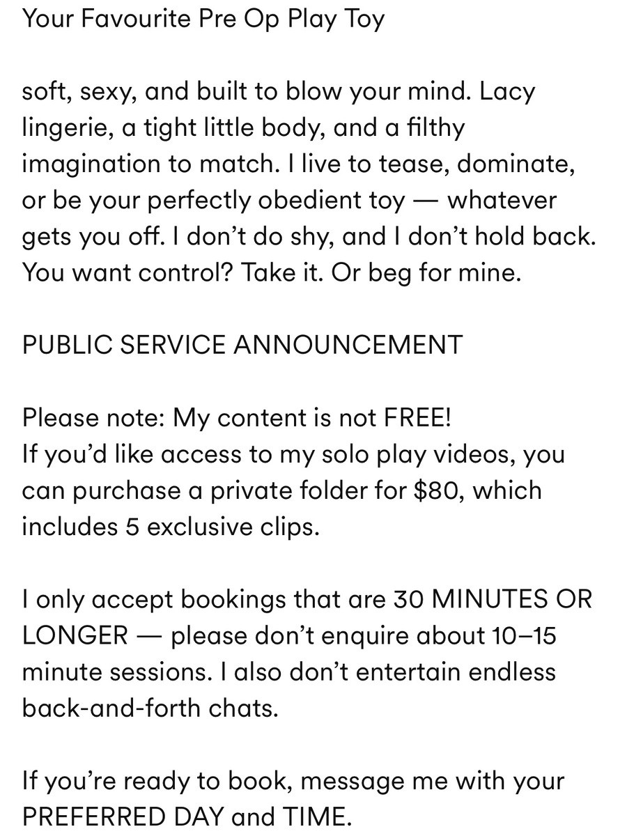I only accept bookings that are 30 MINUTES OR LONGER — please don’t enquire about 10–15 minute sessions. I also don’t entertain endless back-and-forth chats.